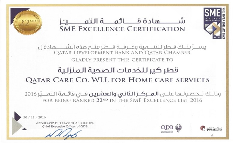 Awards and Recognition Healthcare Asia Award 2024: Home Care and Employee Engagement Initiatives Award Read More » March 25, 2024 2020 – Qatar Care was recognized by Ministry of Public health (MOPH) as the Read More » June 25, 2020 2016 – Ranked 22nd in SME Excellence Ranking in Qatar awarded by Qatar Read More » September 25, 2016 2012 – Qatar Care Honored with Best Small Business Award in the GCC Read More » October 25, 2012 Al Riyada Award – 2012 Read More » August 25, 2012 Address 2nd Floor, Building No.12, Haloul St., Al Mamoura, Doha, Qatar, P.O. Box: 45295 Call Us +974 4447 7789 Email Us info@qatarcare.net
